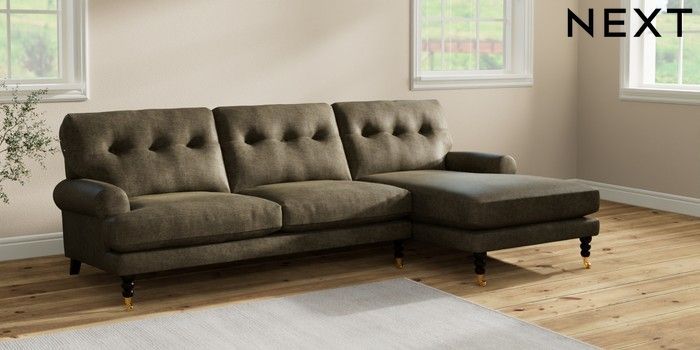 7.2.10 Erin Buttoned Back Deep Relaxed Sit Medium Sofa Chaise - Right Hand Plush Chenille Moss Green High Classic Turned Brass Castor - Dark | Made Click here to use our website with more accessibility support, for example screen readers