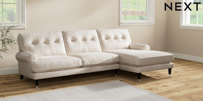 7.2.10 Erin Buttoned Back Deep Relaxed Sit Medium Sofa Chaise - Right Hand Plush Chenille Oyster High Classic Turned Chrome Castor - Dark | Made Click here to use our website with more accessibility support, for example screen readers