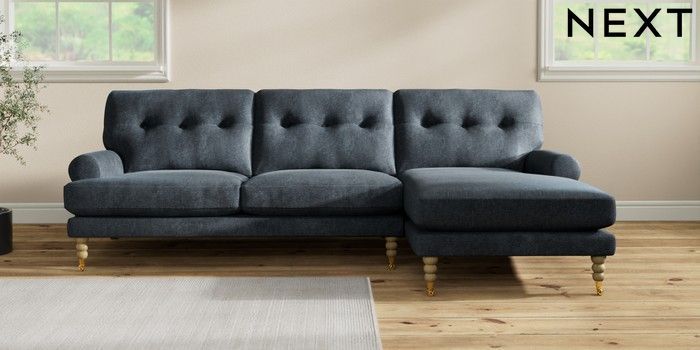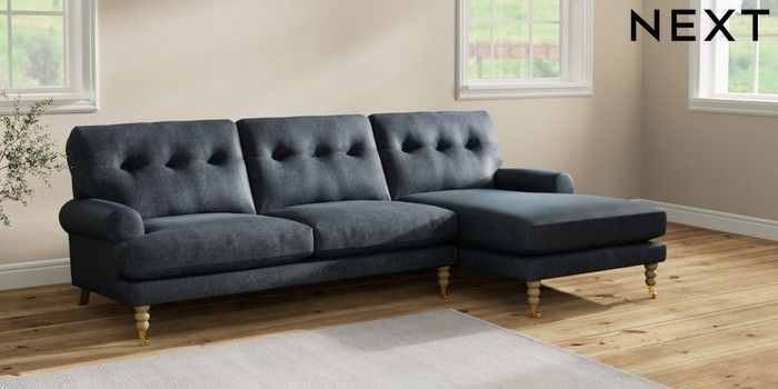 7.2.10 Erin Buttoned Back Deep Relaxed Sit Medium Sofa Chaise - Right Hand Plush Chenille Slate Blue High Classic Turned Brass Castor - Light | Made Click here to use our website with more accessibility support, for example screen readers