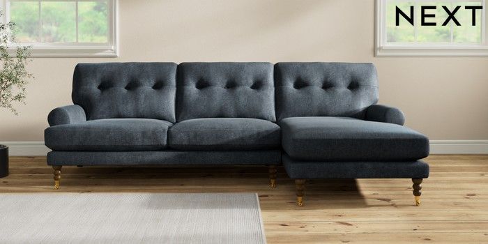 7.2.10 Erin Buttoned Back Deep Relaxed Sit Medium Sofa Chaise - Right Hand Plush Chenille Slate Blue High Classic Turned Brass Castor - Mid | Made Click here to use our website with more accessibility support, for example screen readers