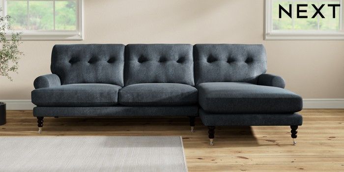 7.2.10 Erin Buttoned Back Deep Relaxed Sit Medium Sofa Chaise - Right Hand Plush Chenille Slate Blue High Classic Turned Chrome Castor - Dark | Made Click here to use our website with more accessibility support, for example screen readers