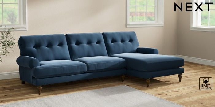 7.2.10 Erin Buttoned Back Deep Relaxed Sit Medium Sofa Chaise - Right Hand Plush Velvet Easy Clean Airforce Blue High Classic Turned - Mid | Made Click here to use our website with more accessibility support, for example screen readers