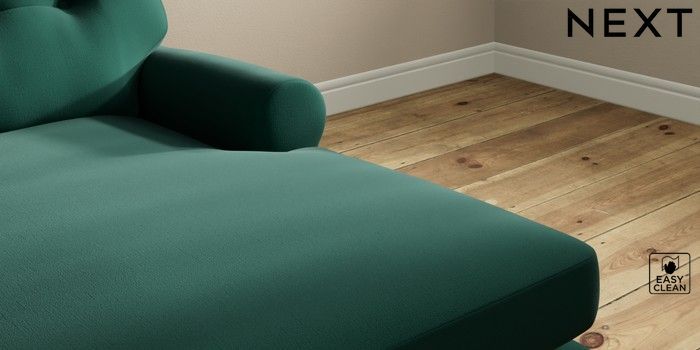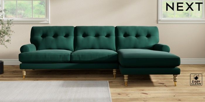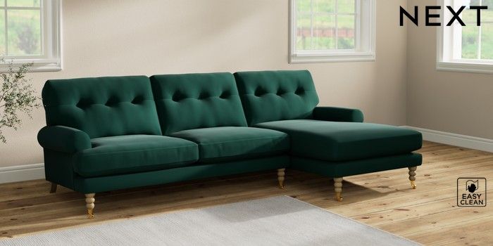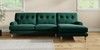 7.2.10 Erin Buttoned Back Deep Relaxed Sit Medium Sofa Chaise - Right Hand Plush Velvet Easy Clean Bottle Green High Classic Turned Brass Castor - Light | Made Click here to use our website with more accessibility support, for example screen readers