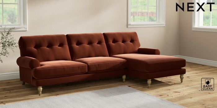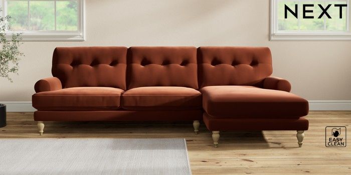 7.2.10 Erin Buttoned Back Deep Relaxed Sit Medium Sofa Chaise - Right Hand Plush Velvet Easy Clean Ginger Orange High Classic Turned - Light | Made Click here to use our website with more accessibility support, for example screen readers