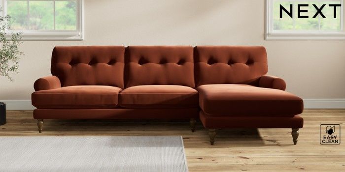 7.2.10 Erin Buttoned Back Deep Relaxed Sit Medium Sofa Chaise - Right Hand Plush Velvet Easy Clean Ginger Orange High Classic Turned - Mid | Made Click here to use our website with more accessibility support, for example screen readers