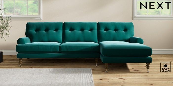 7.2.10 Erin Buttoned Back Deep Relaxed Sit Medium Sofa Chaise - Right Hand Plush Velvet Easy Clean Juniper Green High Classic Turned Chrome Castor - Mid | Made Click here to use our website with more accessibility support, for example screen readers
