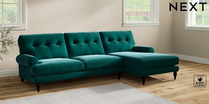 7.2.10 Erin Buttoned Back Deep Relaxed Sit Medium Sofa Chaise - Right Hand Plush Velvet Easy Clean Juniper Green High Classic Turned - Dark | Made Click here to use our website with more accessibility support, for example screen readers