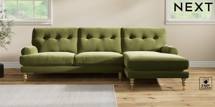 7.2.10 Erin Buttoned Back Deep Relaxed Sit Medium Sofa Chaise - Right Hand Plush Velvet Easy Clean Mid Olive Green High Classic Turned Brass Castor - Light | Made Click here to use our website with more accessibility support, for example screen readers
