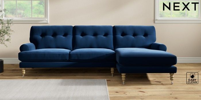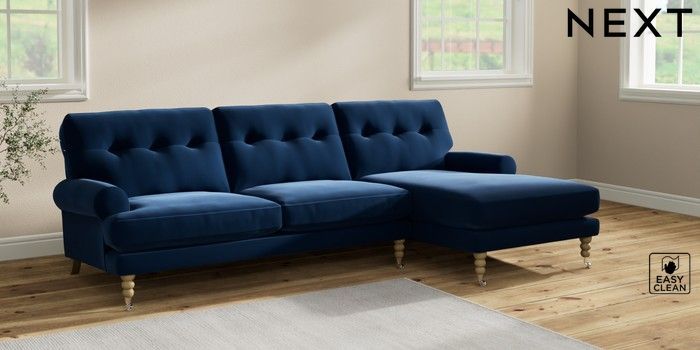 7.2.10 Erin Buttoned Back Deep Relaxed Sit Medium Sofa Chaise - Right Hand Plush Velvet Easy Clean Navy Blue High Classic Turned Chrome Castor - Light | Made Click here to use our website with more accessibility support, for example screen readers