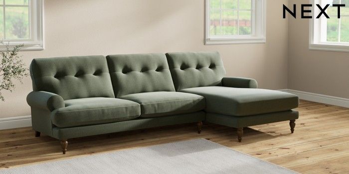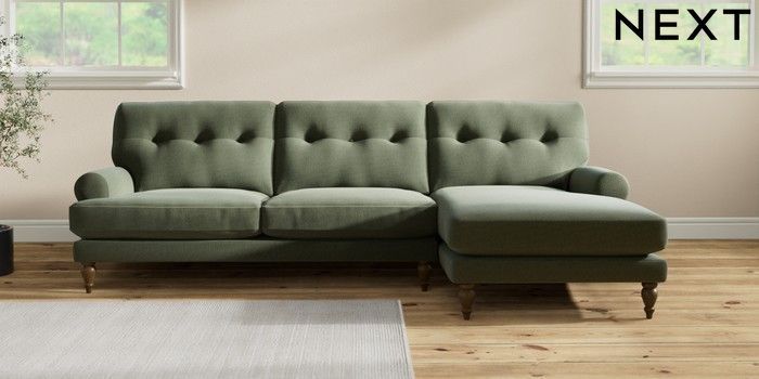 7.2.10 Erin Buttoned Back Deep Relaxed Sit Medium Sofa Chaise - Right Hand Relaxed Linen Look Dark Green High Classic Turned - Mid | Made Click here to use our website with more accessibility support, for example screen readers