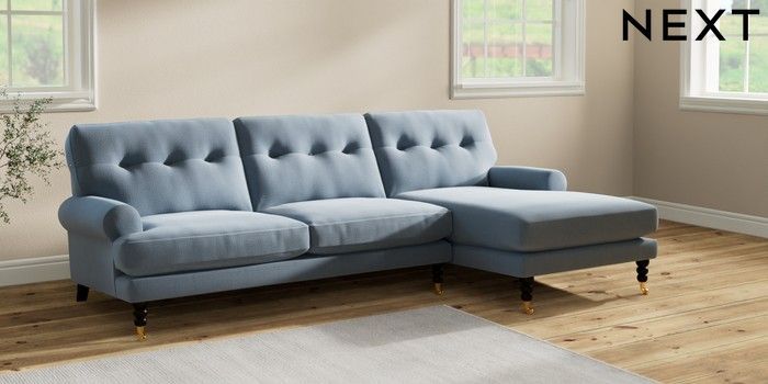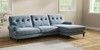 7.2.10 Erin Buttoned Back Deep Relaxed Sit Medium Sofa Chaise - Right Hand Relaxed Linen Look Mid Blue High Classic Turned Brass Castor - Dark | Made Click here to use our website with more accessibility support, for example screen readers