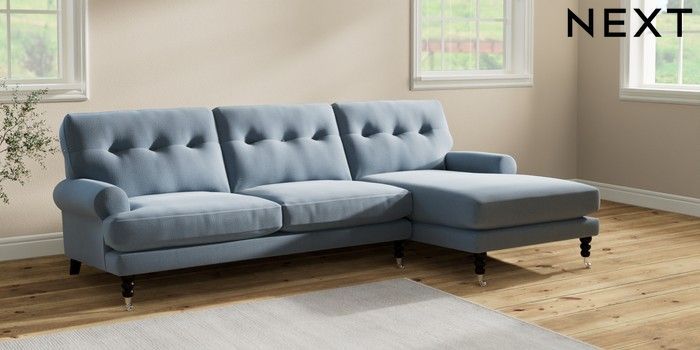 7.2.10 Erin Buttoned Back Deep Relaxed Sit Medium Sofa Chaise - Right Hand Relaxed Linen Look Mid Blue High Classic Turned Chrome Castor - Dark | Made Click here to use our website with more accessibility support, for example screen readers