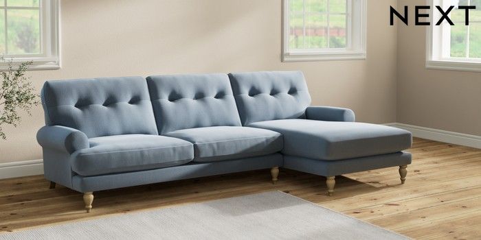 7.2.10 Erin Buttoned Back Deep Relaxed Sit Medium Sofa Chaise - Right Hand Relaxed Linen Look Mid Blue High Classic Turned - Light | Made Click here to use our website with more accessibility support, for example screen readers