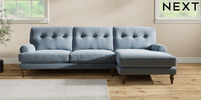 7.2.10 Erin Buttoned Back Deep Relaxed Sit Medium Sofa Chaise - Right Hand Relaxed Linen Look Mid Blue High Classic Turned - Mid | Made Click here to use our website with more accessibility support, for example screen readers