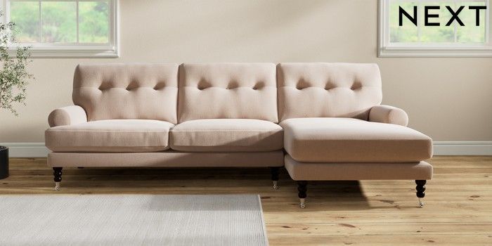 7.2.10 Erin Buttoned Back Deep Relaxed Sit Medium Sofa Chaise - Right Hand Relaxed Linen Look Mid Natural High Classic Turned Chrome Castor - Dark | Made Click here to use our website with more accessibility support, for example screen readers