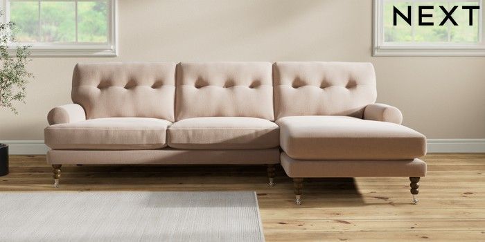 7.2.10 Erin Buttoned Back Deep Relaxed Sit Medium Sofa Chaise - Right Hand Relaxed Linen Look Mid Natural High Classic Turned Chrome Castor - Mid | Made Click here to use our website with more accessibility support, for example screen readers