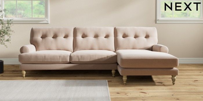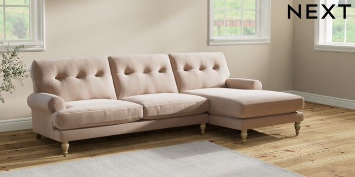 7.2.10 Erin Buttoned Back Deep Relaxed Sit Medium Sofa Chaise - Right Hand Relaxed Linen Look Mid Natural High Classic Turned - Light | Made Click here to use our website with more accessibility support, for example screen readers