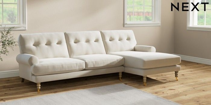 7.2.10 Erin Buttoned Back Deep Relaxed Sit Medium Sofa Chaise - Right Hand Relaxed Linen Look Oyster High Classic Turned Brass Castor - Light | Made Click here to use our website with more accessibility support, for example screen readers