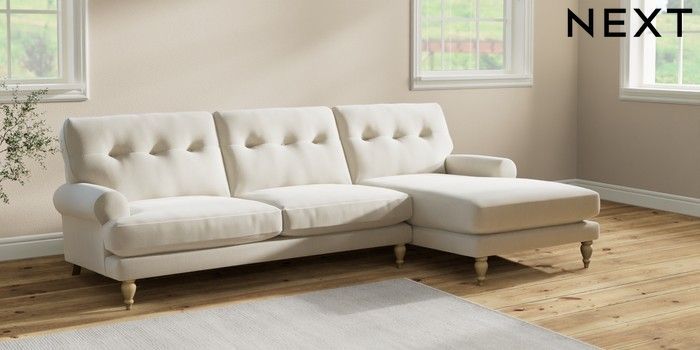 7.2.10 Erin Buttoned Back Deep Relaxed Sit Medium Sofa Chaise - Right Hand Relaxed Linen Look Oyster High Classic Turned - Light | Made Click here to use our website with more accessibility support, for example screen readers