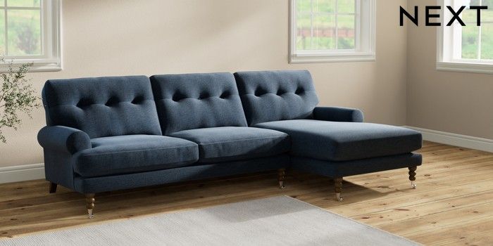 7.2.10 Erin Buttoned Back Deep Relaxed Sit Medium Sofa Chaise - Right Hand Ripple Chenille Dark Blue High Classic Turned Chrome Castor - Mid | Made Click here to use our website with more accessibility support, for example screen readers
