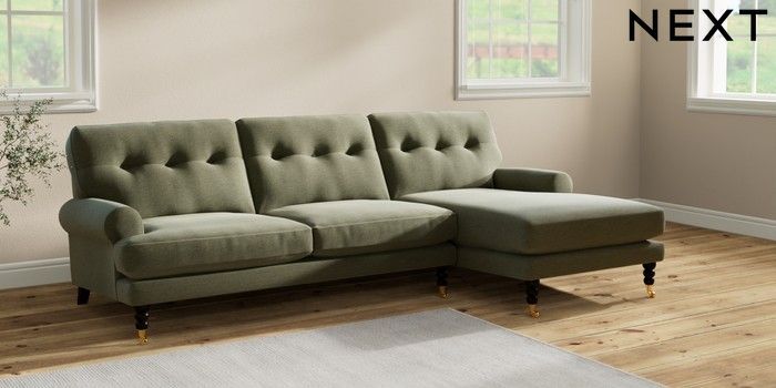 7.2.10 Erin Buttoned Back Deep Relaxed Sit Medium Sofa Chaise - Right Hand Ripple Chenille Mid Moss Green High Classic Turned Brass Castor - Dark | Made Click here to use our website with more accessibility support, for example screen readers
