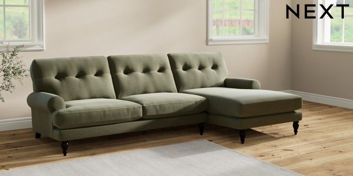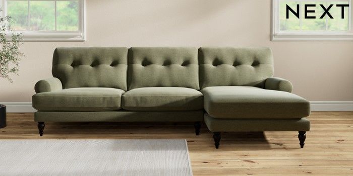 7.2.10 Erin Buttoned Back Deep Relaxed Sit Medium Sofa Chaise - Right Hand Ripple Chenille Mid Moss Green High Classic Turned - Dark | Made Click here to use our website with more accessibility support, for example screen readers