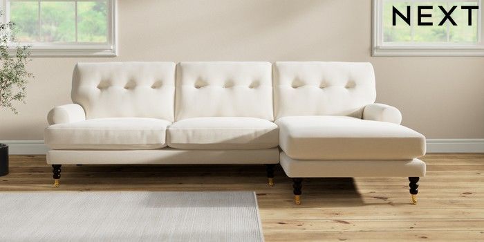 7.2.10 Erin Buttoned Back Deep Relaxed Sit Medium Sofa Chaise - Right Hand Ripple Chenille Oyster High Classic Turned Brass Castor - Dark | Made Click here to use our website with more accessibility support, for example screen readers