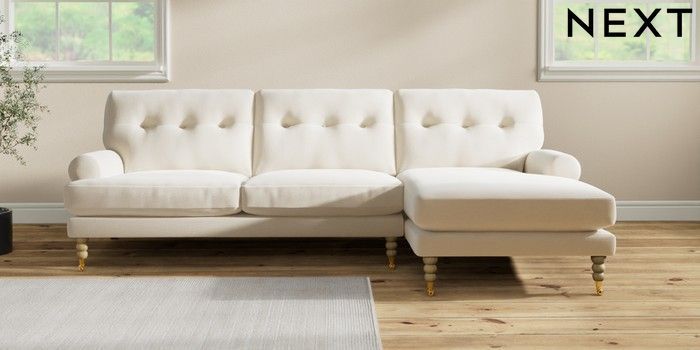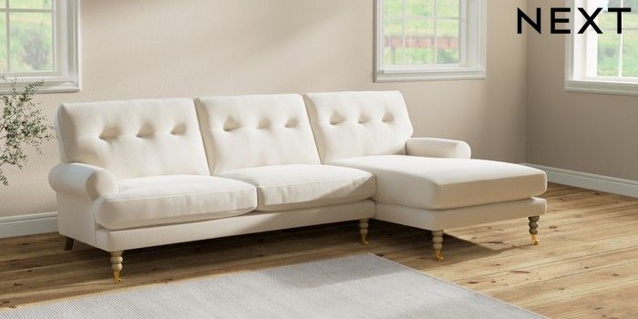 7.2.10 Erin Buttoned Back Deep Relaxed Sit Medium Sofa Chaise - Right Hand Ripple Chenille Oyster High Classic Turned Brass Castor - Light | Made Click here to use our website with more accessibility support, for example screen readers