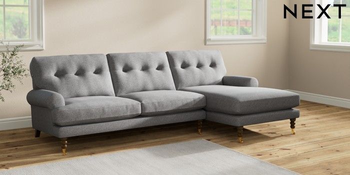 7.2.10 Erin Buttoned Back Deep Relaxed Sit Medium Sofa Chaise - Right Hand Studio Chenille Mid Grey High Classic Turned Brass Castor - Mid | Made Click here to use our website with more accessibility support, for example screen readers