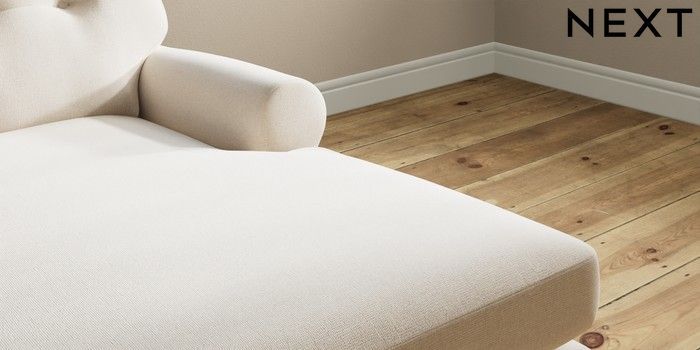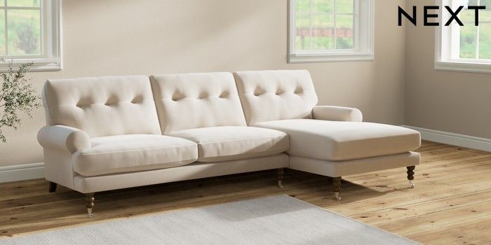 7.2.10 Erin Buttoned Back Deep Relaxed Sit Medium Sofa Chaise - Right Hand Studio Chenille Oyster High Classic Turned Chrome Castor - Mid | Made Click here to use our website with more accessibility support, for example screen readers