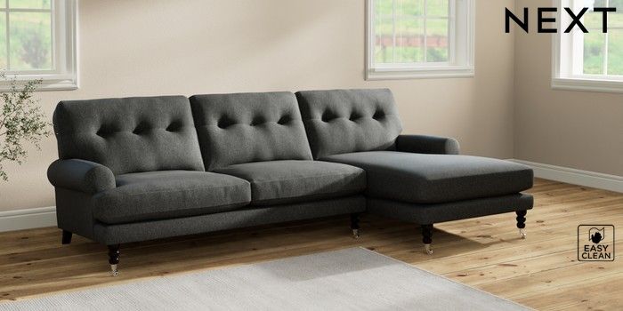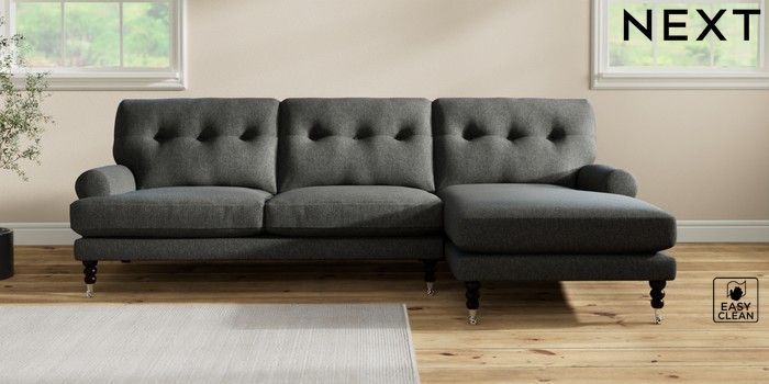7.2.10 Erin Buttoned Back Deep Relaxed Sit Medium Sofa Chaise - Right Hand Tweedy Blend Easy Clean Charcoal Grey High Classic Turned Chrome Castor - Dark | Made Click here to use our website with more accessibility support, for example screen readers