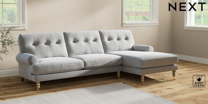 7.2.10 Erin Buttoned Back Deep Relaxed Sit Medium Sofa Chaise - Right Hand Tweedy Blend Easy Clean Light Silver Grey High Classic Turned Brass Castor - Light | Made Click here to use our website with more accessibility support, for example screen readers