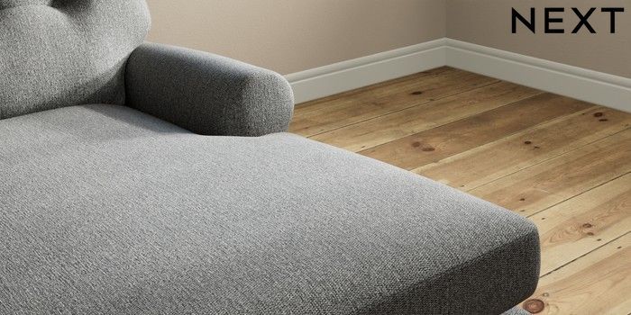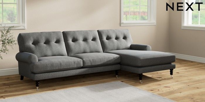 7.2.10 Erin Buttoned Back Deep Relaxed Sit Medium Sofa Chaise - Right Hand Tweedy Chenille Dark Grey High Classic Turned Chrome Castor - Dark | Made Click here to use our website with more accessibility support, for example screen readers