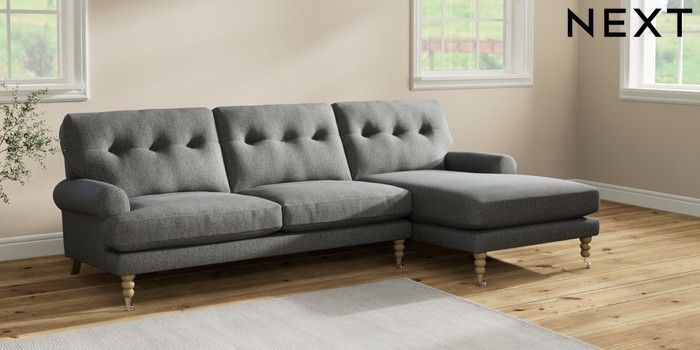 7.2.10 Erin Buttoned Back Deep Relaxed Sit Medium Sofa Chaise - Right Hand Tweedy Chenille Dark Grey High Classic Turned Chrome Castor - Light | Made Click here to use our website with more accessibility support, for example screen readers