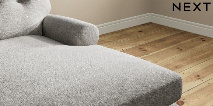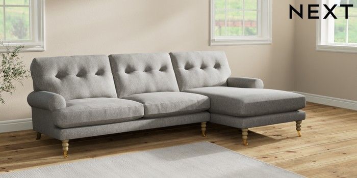 7.2.10 Erin Buttoned Back Deep Relaxed Sit Medium Sofa Chaise - Right Hand Tweedy Chenille Mid Grey High Classic Turned Brass Castor - Light | Made Click here to use our website with more accessibility support, for example screen readers