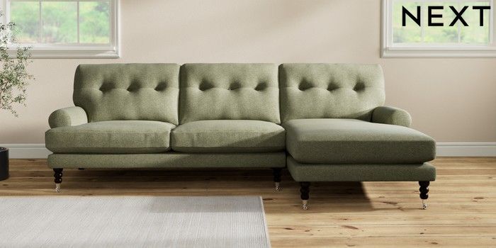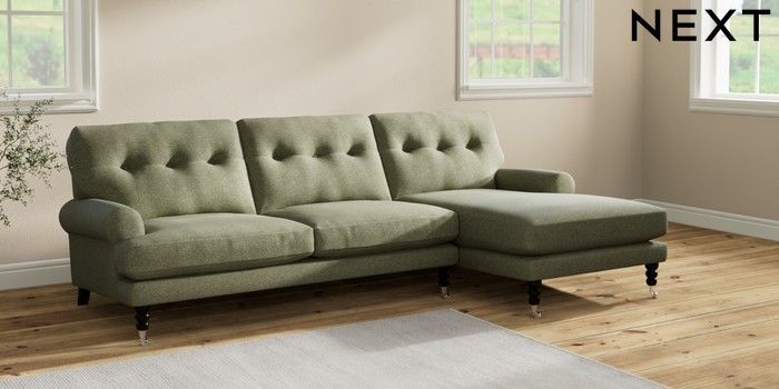 7.2.10 Erin Buttoned Back Deep Relaxed Sit Medium Sofa Chaise - Right Hand Tweedy Chenille Mid Moss Green High Classic Turned Chrome Castor - Dark | Made Click here to use our website with more accessibility support, for example screen readers