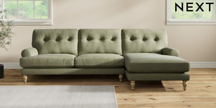 7.2.10 Erin Buttoned Back Deep Relaxed Sit Medium Sofa Chaise - Right Hand Tweedy Chenille Mid Moss Green High Classic Turned - Light | Made Click here to use our website with more accessibility support, for example screen readers
