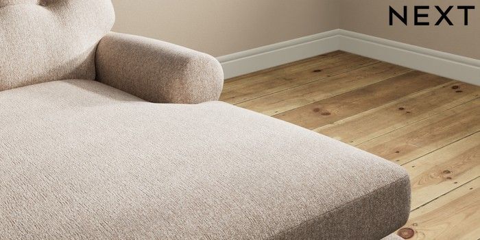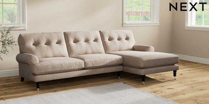 7.2.10 Erin Buttoned Back Deep Relaxed Sit Medium Sofa Chaise - Right Hand Tweedy Chenille Mid Natural High Classic Turned Chrome Castor - Dark | Made Click here to use our website with more accessibility support, for example screen readers