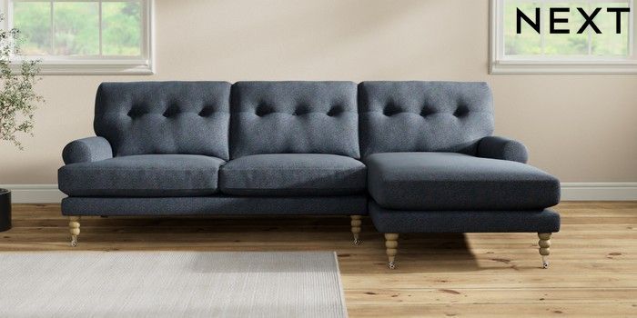 7.2.10 Erin Buttoned Back Deep Relaxed Sit Medium Sofa Chaise - Right Hand Tweedy Chenille Navy Blue High Classic Turned Chrome Castor - Light | Made Click here to use our website with more accessibility support, for example screen readers