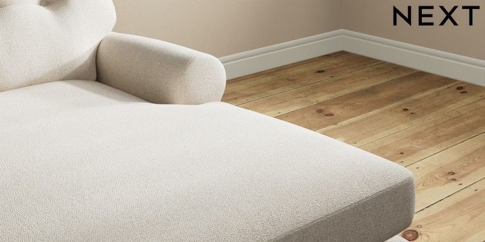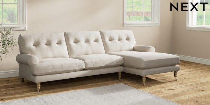 7.2.10 Erin Buttoned Back Deep Relaxed Sit Medium Sofa Chaise - Right Hand Tweedy Chenille Oyster High Classic Turned Chrome Castor - Light | Made Click here to use our website with more accessibility support, for example screen readers