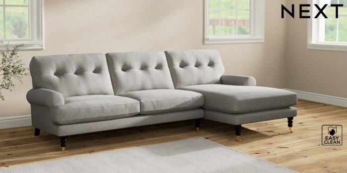 7.2.10 Erin Buttoned Back Deep Relaxed Sit Medium Sofa Chaise - Right Hand Woven Chenille Easy Clean Light Grey High Classic Turned Brass Castor - Dark | Made Click here to use our website with more accessibility support, for example screen readers