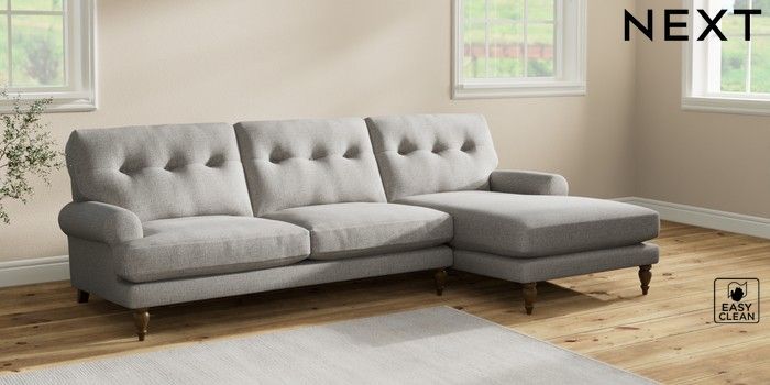 7.2.10 Erin Buttoned Back Deep Relaxed Sit Medium Sofa Chaise - Right Hand Woven Chenille Easy Clean Light Grey High Classic Turned - Mid | Made Click here to use our website with more accessibility support, for example screen readers