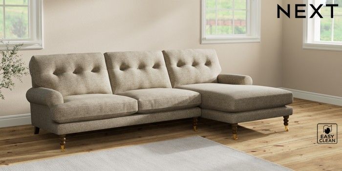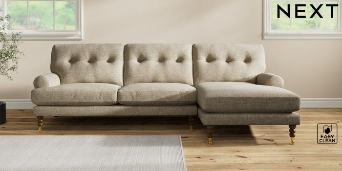 7.2.10 Erin Buttoned Back Deep Relaxed Sit Medium Sofa Chaise - Right Hand Woven Chenille Easy Clean Mid Natural High Classic Turned Brass Castor - Mid | Made Click here to use our website with more accessibility support, for example screen readers