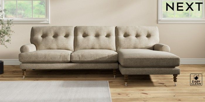 7.2.10 Erin Buttoned Back Deep Relaxed Sit Medium Sofa Chaise - Right Hand Woven Chenille Easy Clean Mid Natural High Classic Turned Chrome Castor - Mid | Made Click here to use our website with more accessibility support, for example screen readers