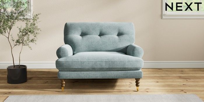 7.2.10 Erin Buttoned Back Deep Relaxed Sit Snuggle Chunky Chenille Light Teal Green High Classic Turned Brass Castor - Mid | Made Click here to use our website with more accessibility support, for example screen readers