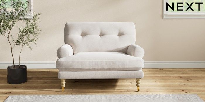 7.2.10 Erin Buttoned Back Deep Relaxed Sit Snuggle Chunky Chenille Oyster High Classic Turned Brass Castor - Light | Made Click here to use our website with more accessibility support, for example screen readers