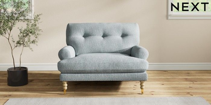 7.2.10 Erin Buttoned Back Deep Relaxed Sit Snuggle Chunky Weave Mid Blue High Classic Turned Brass Castor - Light | Made Click here to use our website with more accessibility support, for example screen readers