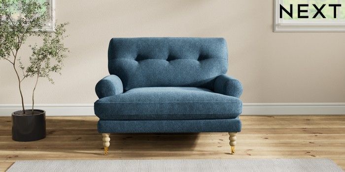 7.2.10 Erin Buttoned Back Deep Relaxed Sit Snuggle Cotswold Chenille Dark Blue High Classic Turned Brass Castor - Light | Made Click here to use our website with more accessibility support, for example screen readers