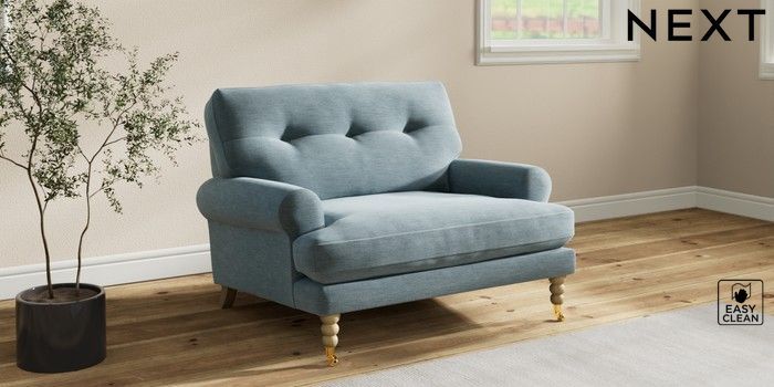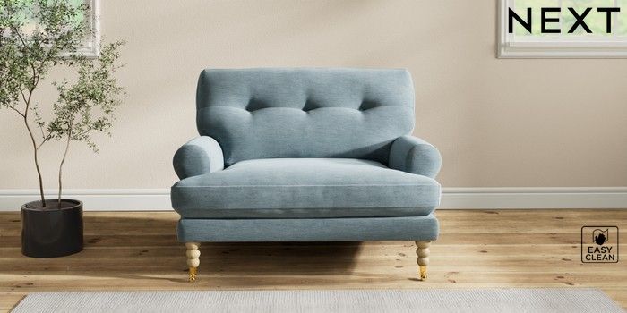 7.2.10 Erin Buttoned Back Deep Relaxed Sit Snuggle Fine Chenille Easy Clean Mid Blue High Classic Turned Brass Castor - Light | Made Click here to use our website with more accessibility support, for example screen readers