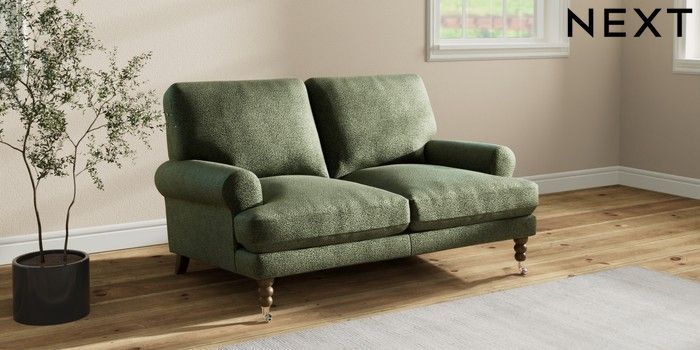 7.2.10 Erin Deep Relaxed Sit 2 Seater Small Sofa Boucle Chenille Dark Moss Green High Classic Turned Chrome Castor - Mid | Made Click here to use our website with more accessibility support, for example screen readers